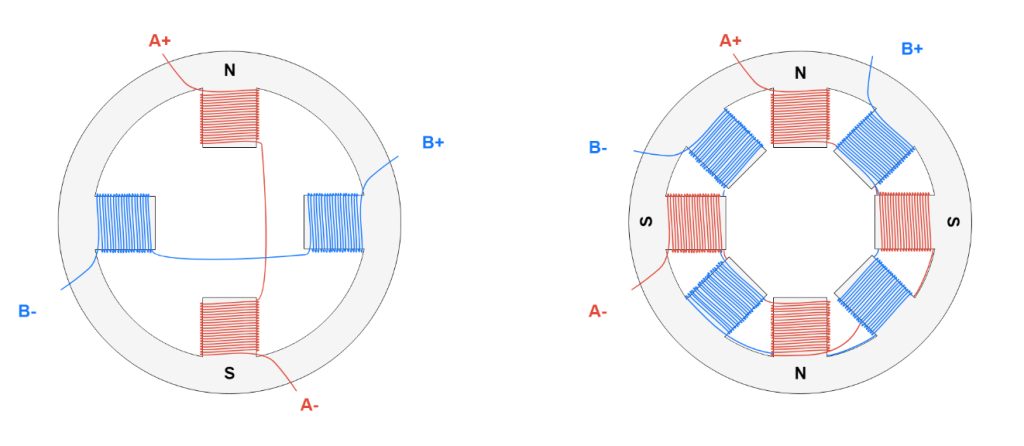 The performance of a stepper motor — both in terms of resolution (or step size), speed, and torque — is influenced by construction details, which at the same time may also affect how the motor can be controlled. As a matter of fact, not all stepper motors have the same internal structure (or construction), as there are different rotor and stator configurations.