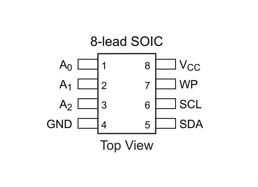 The EEPROM IC can be easily connected to an MCU/MPU. The diagram below can be referred to as the pinout and the connections of 24C64 to an MCU/MPU.