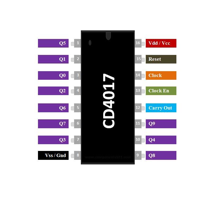 | 1 to 7 and 9,10,11 | Output pins Q0 to Q9 | These are the 10 output pins on which the counting occurs, they are not in order hence verify the pin diagram above |