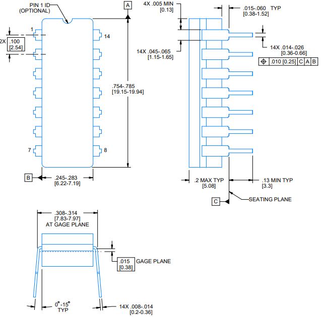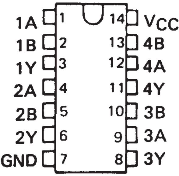 - Four independent 2-input positive-NAND buffer gates in a single 14-pin DIP package.