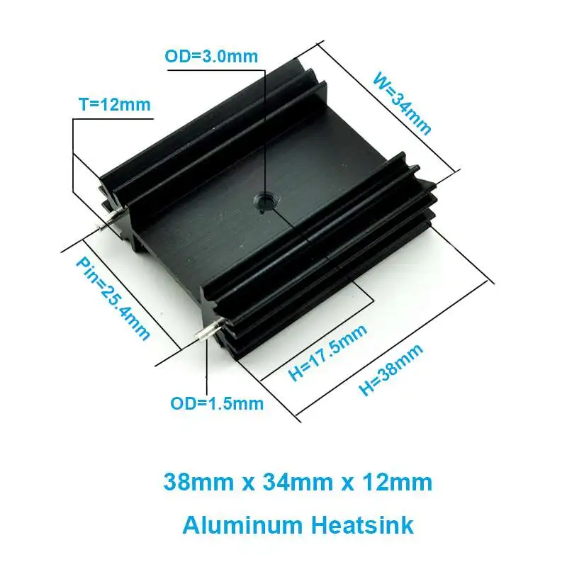 This high-quality aluminum heatsink is designed for high-power semiconductor packages, specifically the TO-247 and TO-3P outlines. Its compact 38mm height and black finish provide excellent thermal dissipation for power transistors, MOSFETs, and voltage regulators.