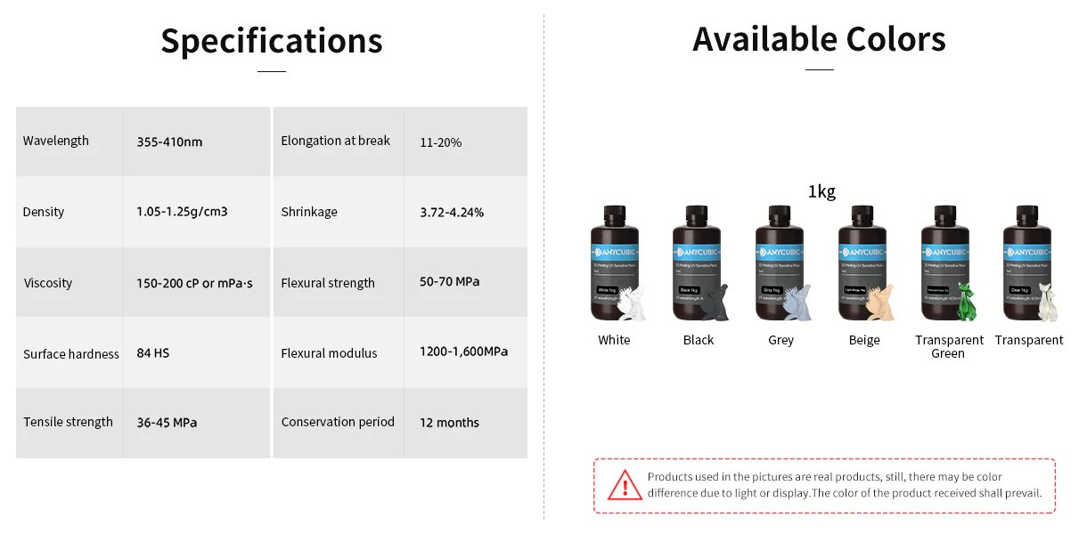 - Top-Choice for Entry-Level Users: Following the classic formula, Anycubic Standard Colored UV Resin is well integrated and in balance with the performance on printing precision, hardness, fluidity, etc.