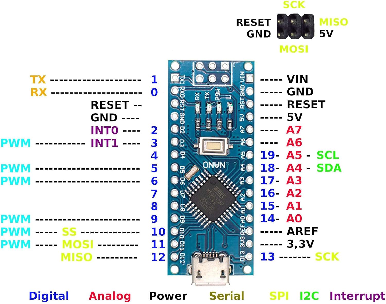 - 14 digital I/O pins, including 6 PWM outputs.