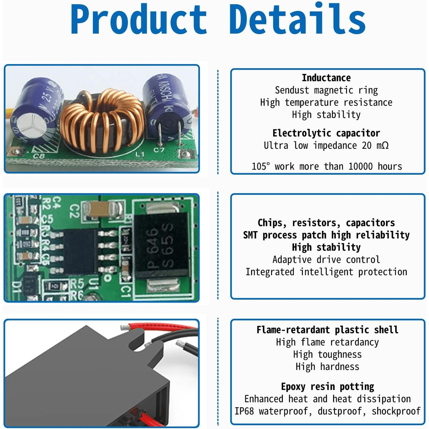 - Compact and Durable Design: Small form factor with a flame-retardant plastic shell and epoxy resin potting for enhanced safety and durability.