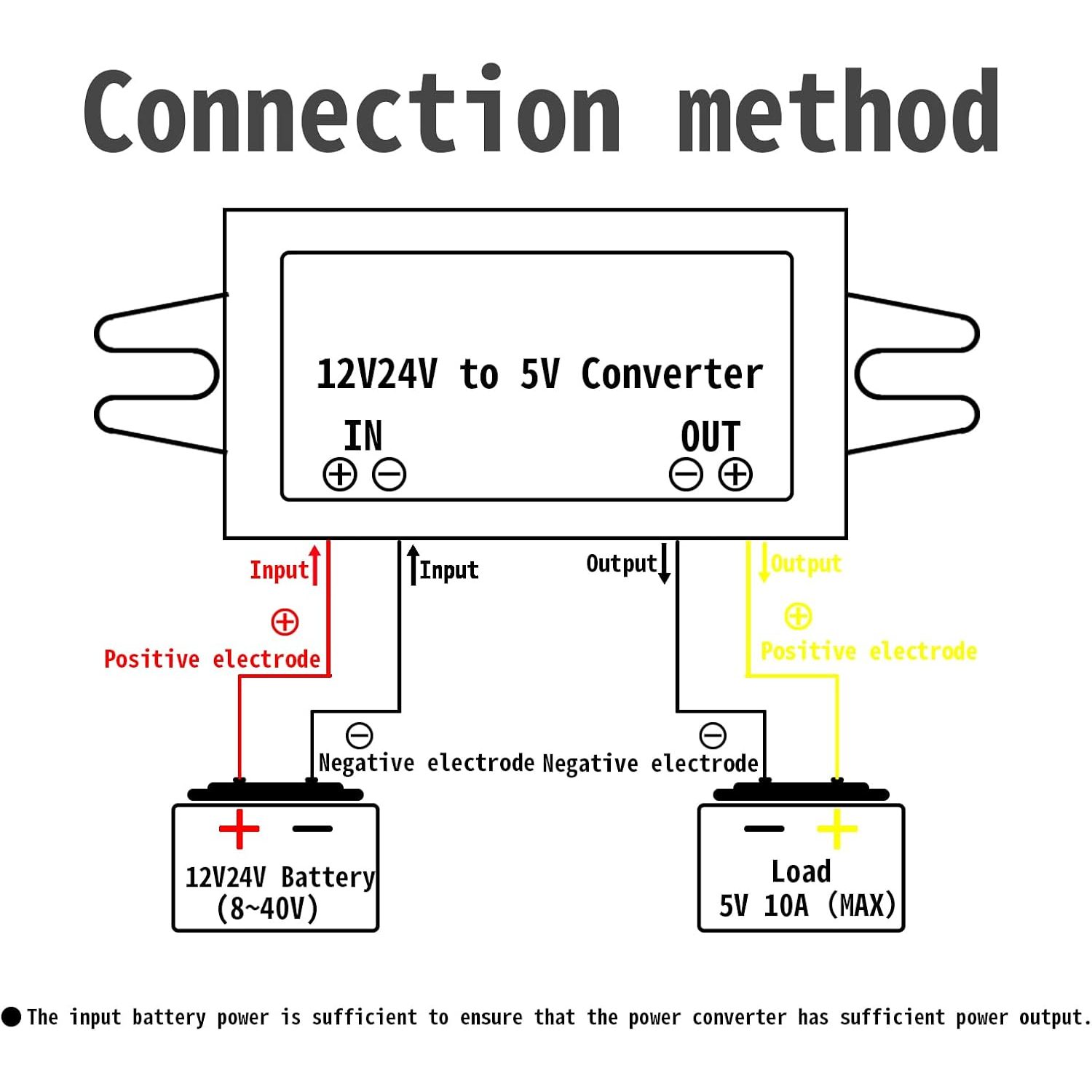 | Wire Configuration | Red (positive input), Yellow (positive output), Black (ground) |