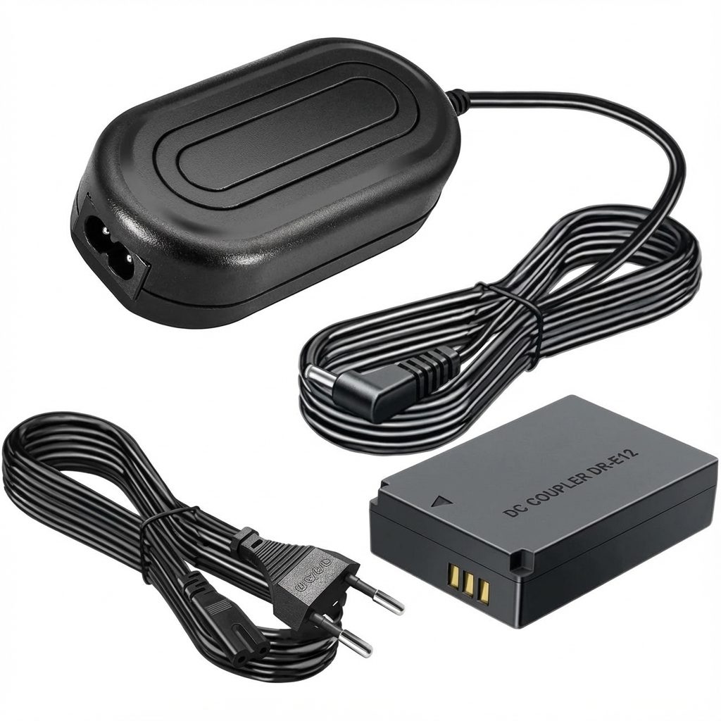 Never run out of battery again during your shoots. This AC Power Adapter Kit replaces your standard Canon LP-E12 battery, allowing you to power your camera directly from a wall outlet. It is the perfect solution for studio photography, long video recording sessions, live streaming, and using your camera as a high-quality webcam.