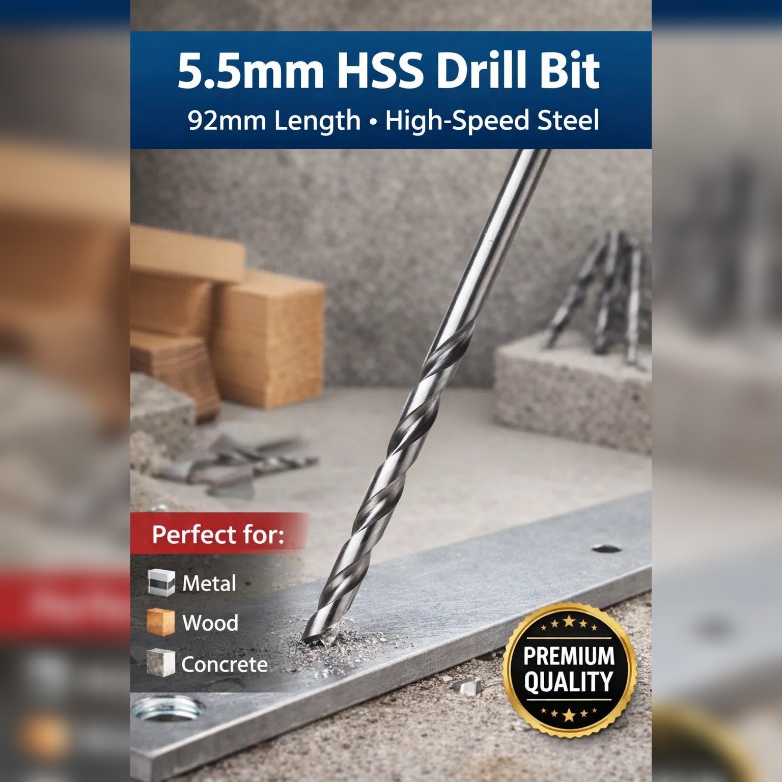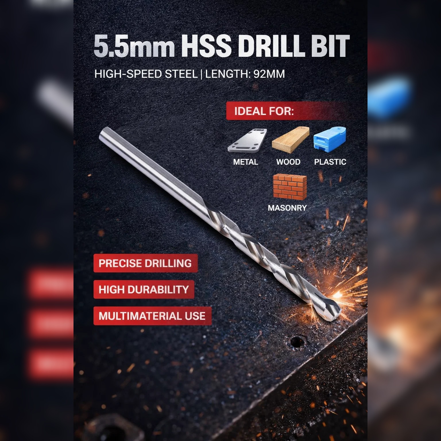 The Drill Tip 5.5mm is a precision‑ground twist drill bit crafted from durable High Speed Steel (HSS), engineered to deliver reliable drilling performance across a variety of materials. With a nominal diameter of 5.5 mm and an overall length of 92 mm, this drill bit offers the ideal balance between reach and rigidity, making it suitable for both handheld and machine drilling applications. The HSS construction ensures that the bit maintains strength and sharpness even under heavy use, resisting heat buildup and wear that typically occurs during drilling operations into metals and other hard surfaces.