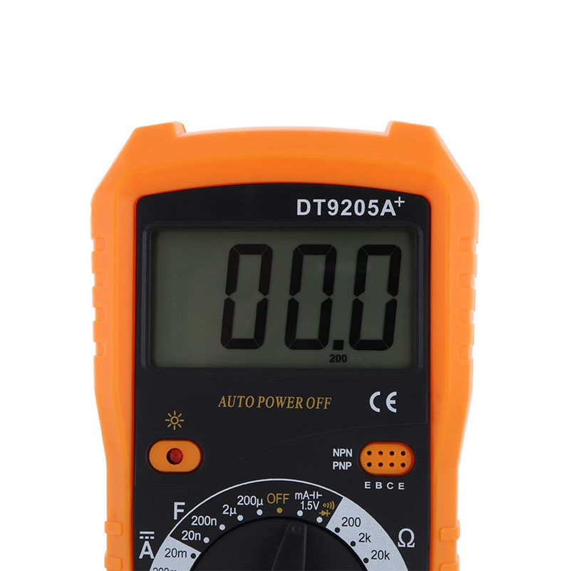 The DT-9205A+ digital multimeter offers a blend of practicality and utileness. Its rectangular body, with rubberized grips on the sides, feels sturdy in the hand, and its face is dominated by a clear LCD panel with large digits. Below the display, the rotary switch sits solidly, each click reassuring, giving a tactile sense of control as you select measurement modes. The test leads plug in firmly, and the overall feel is that of a tool built for day-to-day use, not delicate handling.