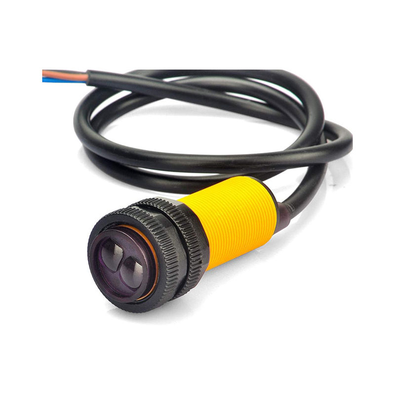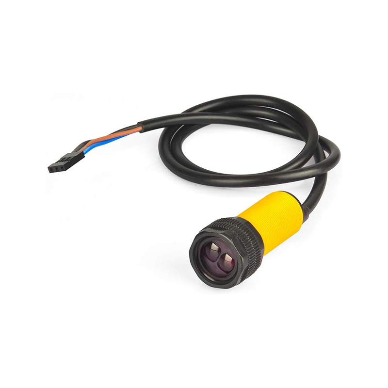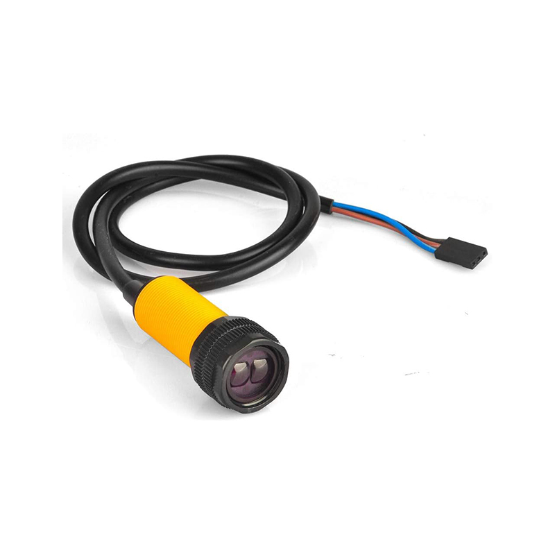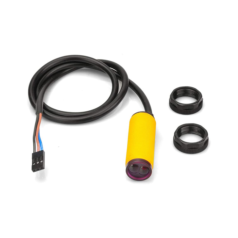 The E18-D80NK is a compact infrared (IR) photoelectric proximity sensor designed to detect the presence of objects without physical contact. Inside its small cylindrical plastic housing resides both an IR LED emitter and a phototransistor receiver. The sensor emits invisible infrared light and listens for reflections: when an object enters its field of view and reflects the IR beam, the sensor’s electronics detect the return signal and trigger a digital output. This makes it a non-contact “switch,” ideal for automation tasks where mechanical contact would be undesirable or impractical.