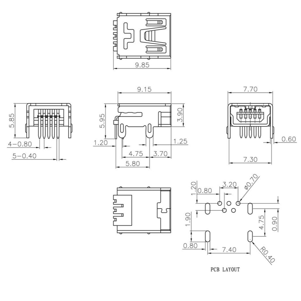 - 1x Female Mini-B USB Connector Right-Angle 5Pins Dip Solder.