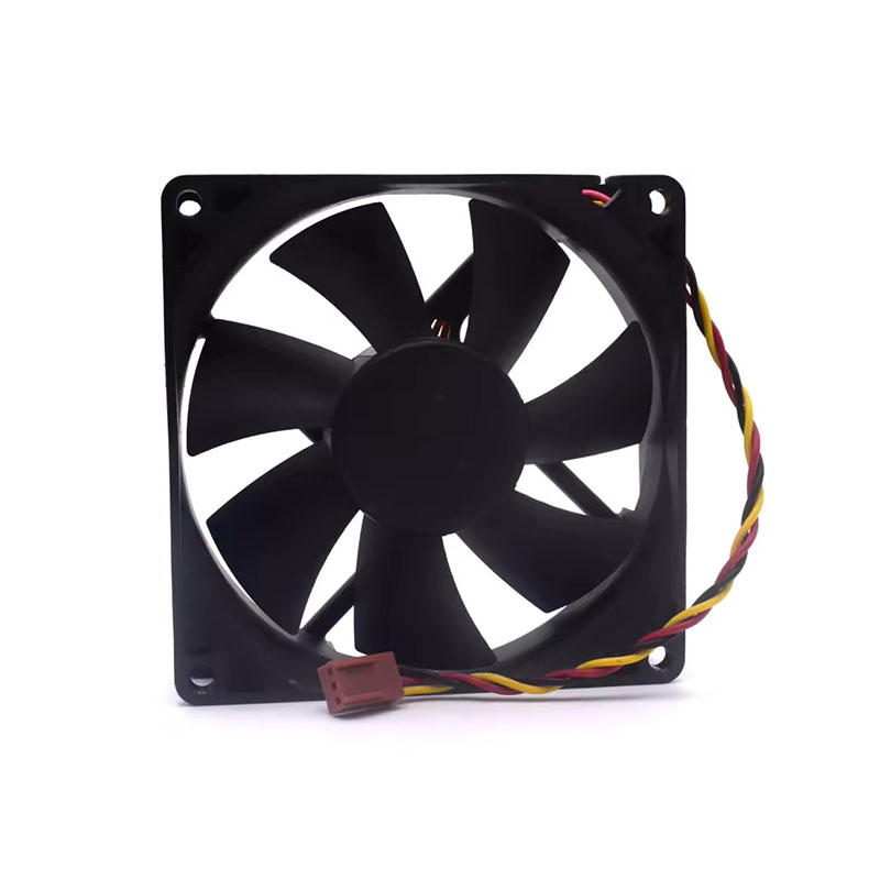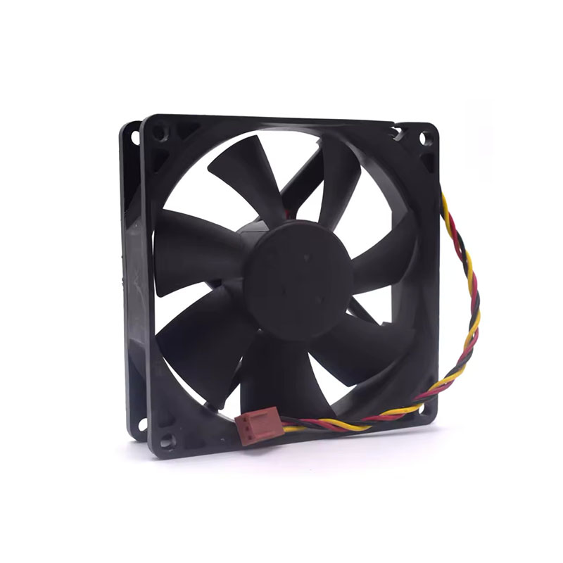 Inside, the rotor and blades operate with a balanced precision. As the fan spins, there is a smooth and steady hum rather than harsh whine. Its motion feels deliberate, calibrated to push air efficiently without turbulence or dramatic pulsations. The junction between blades and hub is seamless, minimizing drag and vibration. The fan’s three-wire lead trails neatly from one corner, unobtrusive yet clearly delineated, ready for integration into power and monitoring systems.