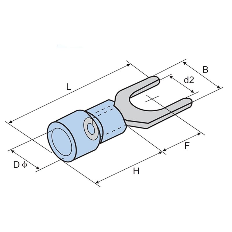 | Model | Wire Range (mm²) | Stud Size | d₂ (Inner Fork Width) | F (Fork Length) | L (Total Length) | H (Barrel Length) | D φ (Insulation Ø) | Color | Max Current |