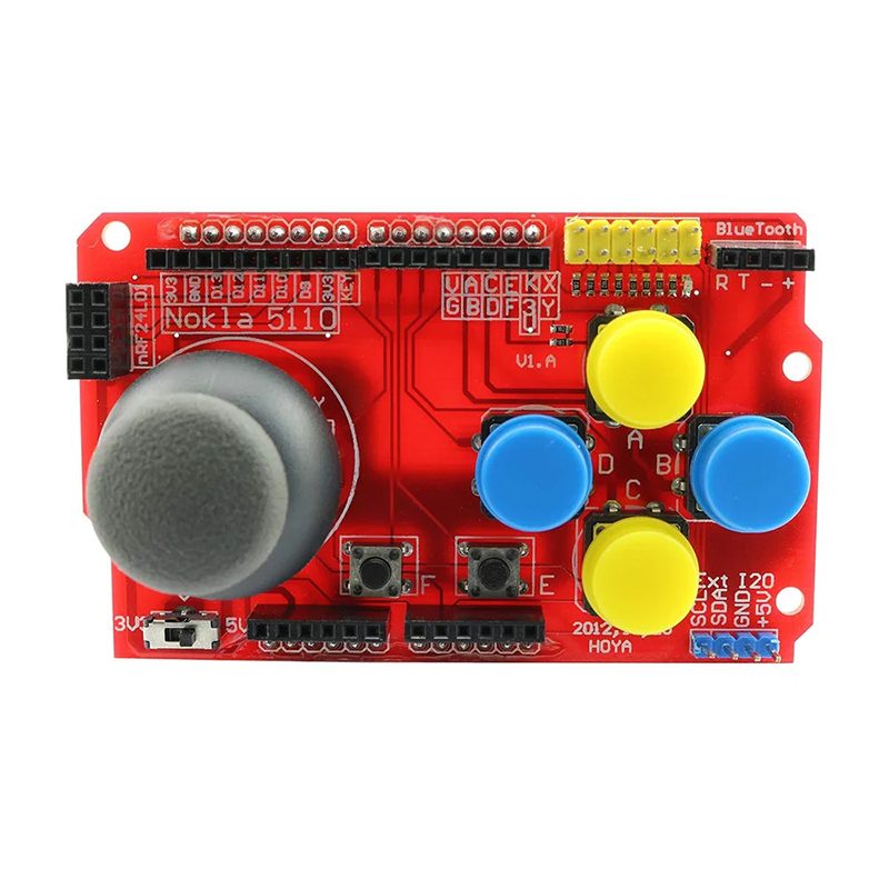Electrically the shield is simple to integrate: analog outputs from the joystick provide variable X/Y readings while the pushbuttons (including the joystick’s select switch) act as digital inputs. The shield includes extra breakout headers to mount commonly paired modules for example a Nokia 5110 LCD or an nRF24L01 radio so you can build interactive displays or wireless controllers using the same board. The physical layout mirrors Arduino Uno/Mega stack-up to keep connections intuitive.