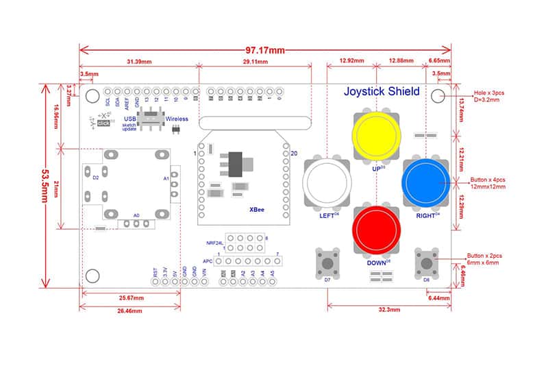- Arduino Uno and Mega compatible shield for joystick control.