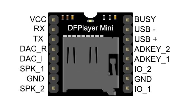 A module that allows you to play music files directly from micro SD card via the built-in slot. It communicates through the UART interface – pins RX and TX, with a microcontroller. DFPlayer works with Mp3, WAV, WMA, supports file systems FAT16 and FAT32.