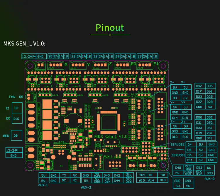 MKS BASE-L is suitable for 3D printer manufacturers on batch production and is used as the main control board. Compared to the Ramps1.4, it adds E1 heating output.