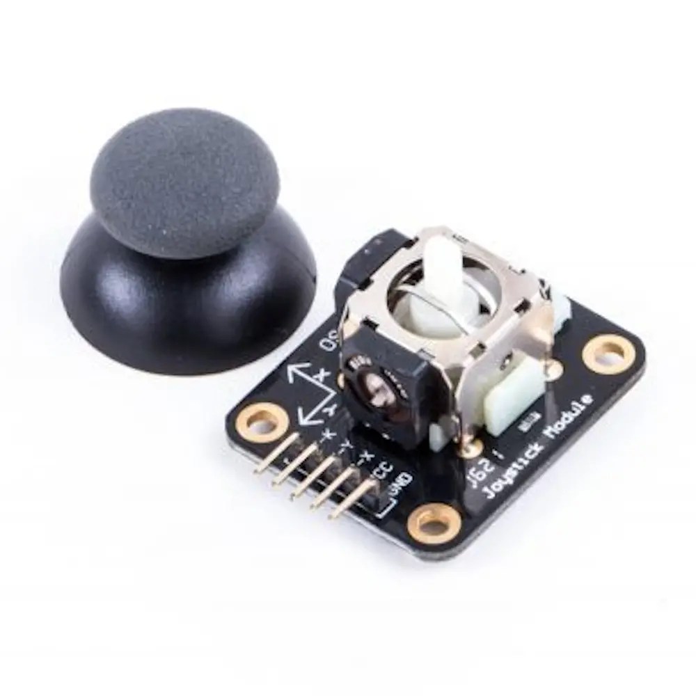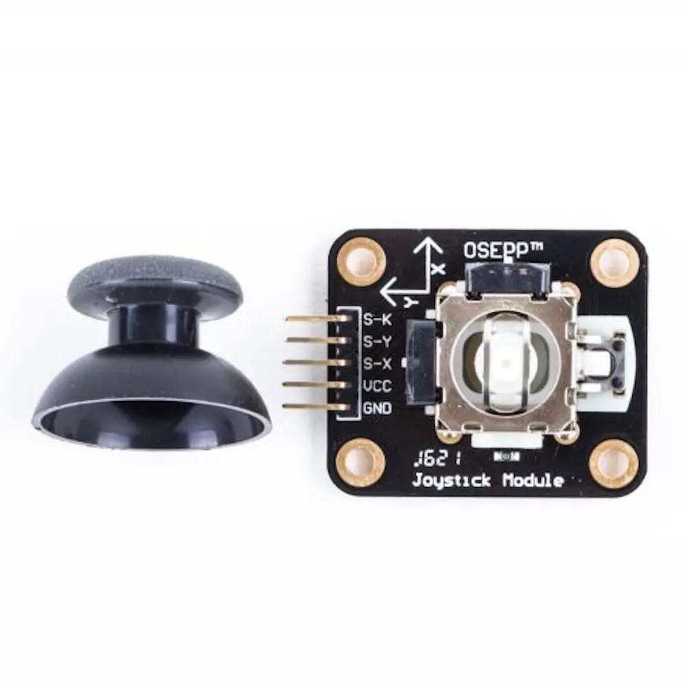 The OSEPP JOY‑01 Joystick Module is a versatile input device designed for use in a wide range of electronics and embedded projects requiring directional control and user interface input. This module integrates two independent analog potentiometers — one for the X‑axis and one for the Y‑axis — enabling precise two‑dimensional position sensing. Each axis has a 10K potentiometer with a common ground, providing smooth and repeatable analog voltage outputs that correspond to joystick position.