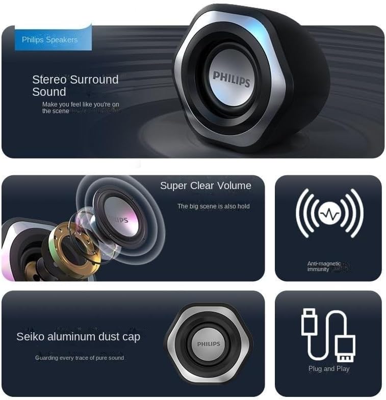 The Philips SPA2209 Multimedia Speaker is a compact and efficient audio solution designed to elevate your multimedia experience, whether you’re listening to music, watching movies, or playing games. Featuring a 2.0 channel stereo configuration, these speakers deliver clear and balanced sound, making them an excellent choice for personal use in home, office, or travel settings. With a total power output of 5W, the SPA2209 provides sufficient volume to fill small to medium-sized rooms, offering an immersive audio experience for casual listening or focused tasks.