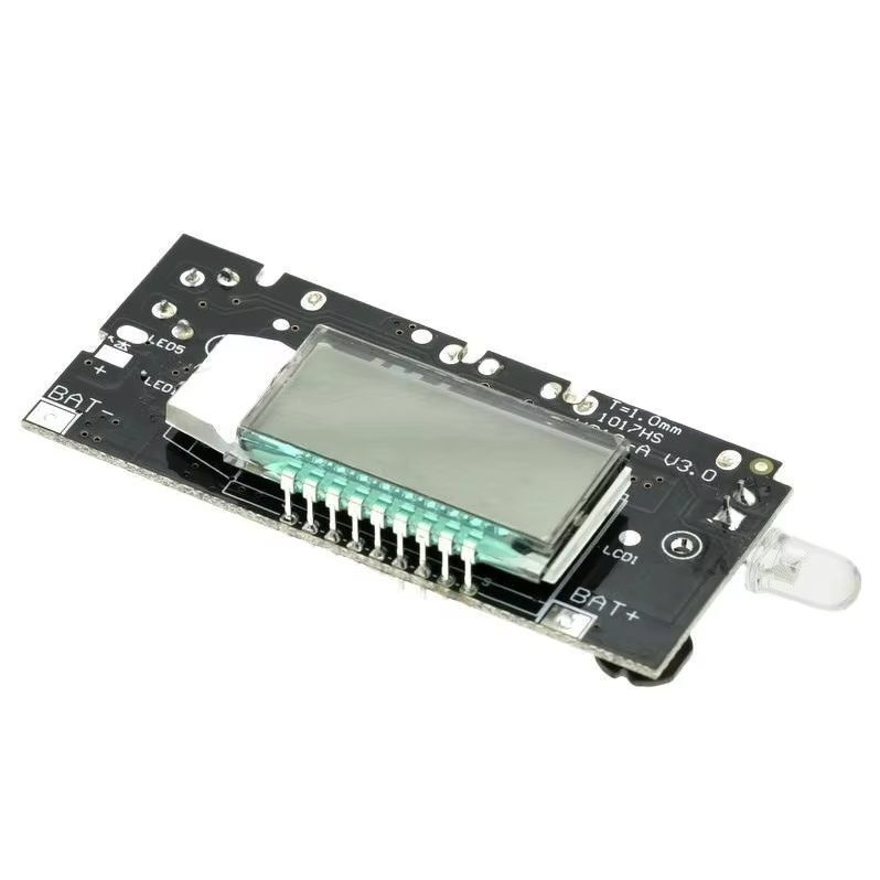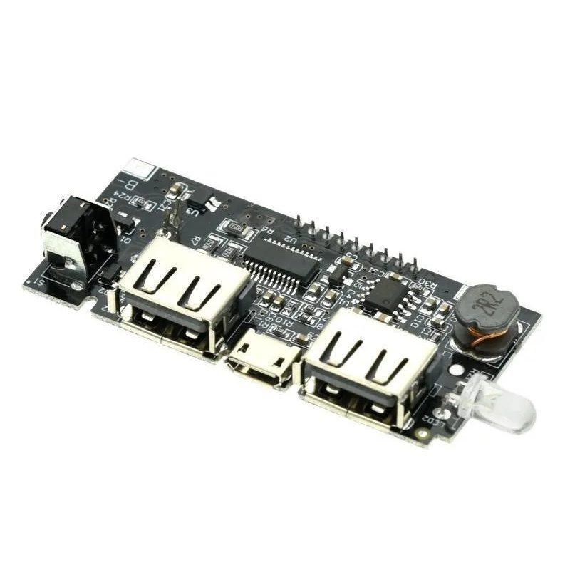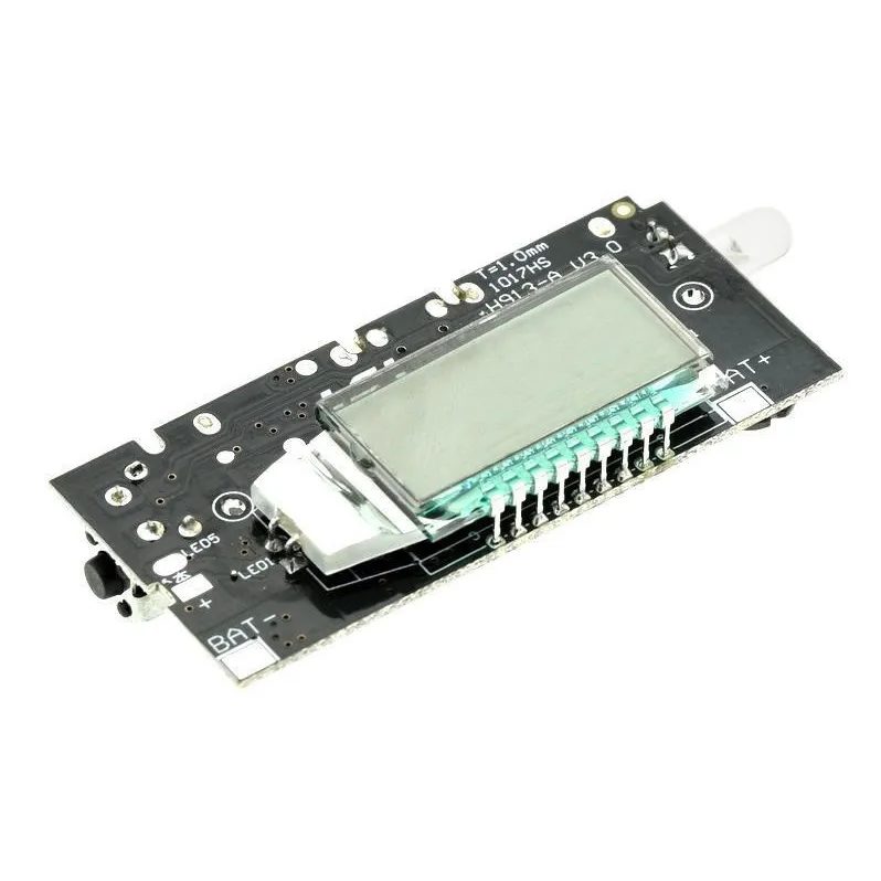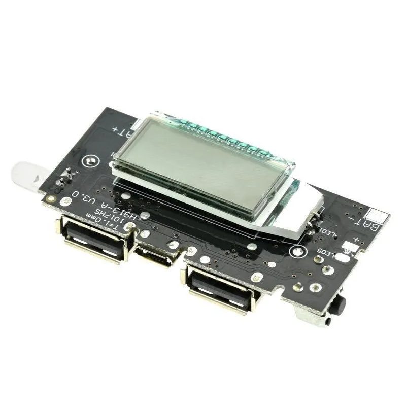 This charging board for a mobile power bank contains converters for two 5V outputs with a maximum current of 2.1 and 1.0 A, a charging circuit from micro USB 5V, a built-in LCD indicator with blue backlight and a display of the percentage of charge and connected outputs, a built-in LED flashlight.