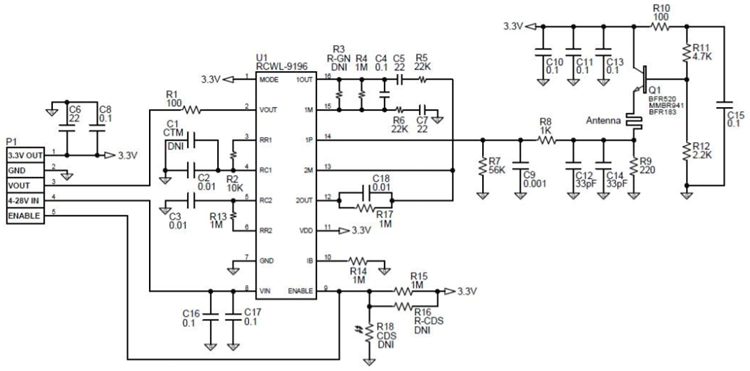 RCWL0516 IC, which is a complete RF Doppler system in a chip is the heart of the module. The peripheral components act as power supply decoupling and filtering and set operating points. The RF section consists of a high-speed NPN transistor Q1, which forms a Colpitts oscillator. The antenna is a trace on the PCB.