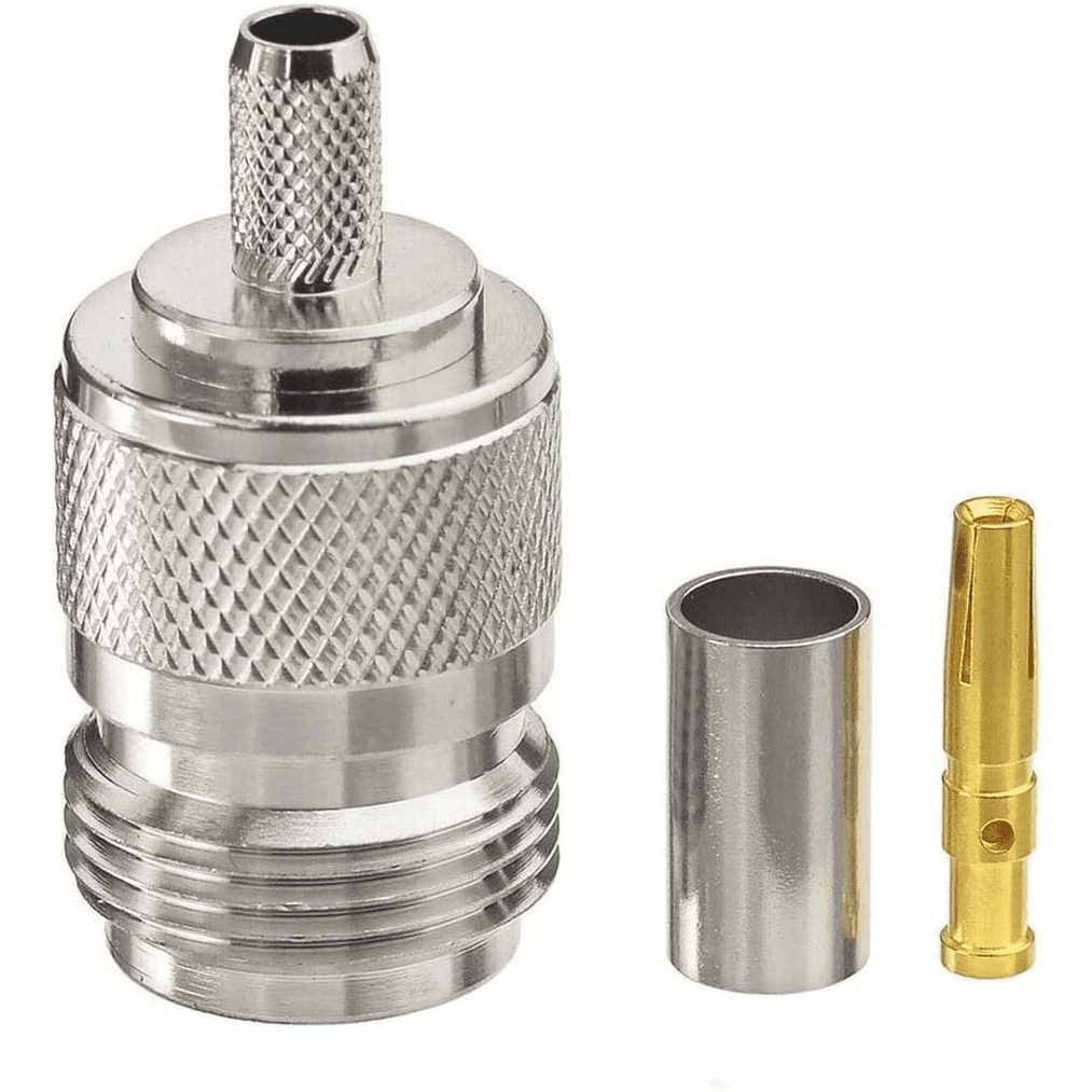 N-Type Female Crimp Connector, 50 Ohm, for RG-58 & LMR-195. Silver-plated brass, PTFE dielectric, DC-11 GHz. Secure, weatherproof.