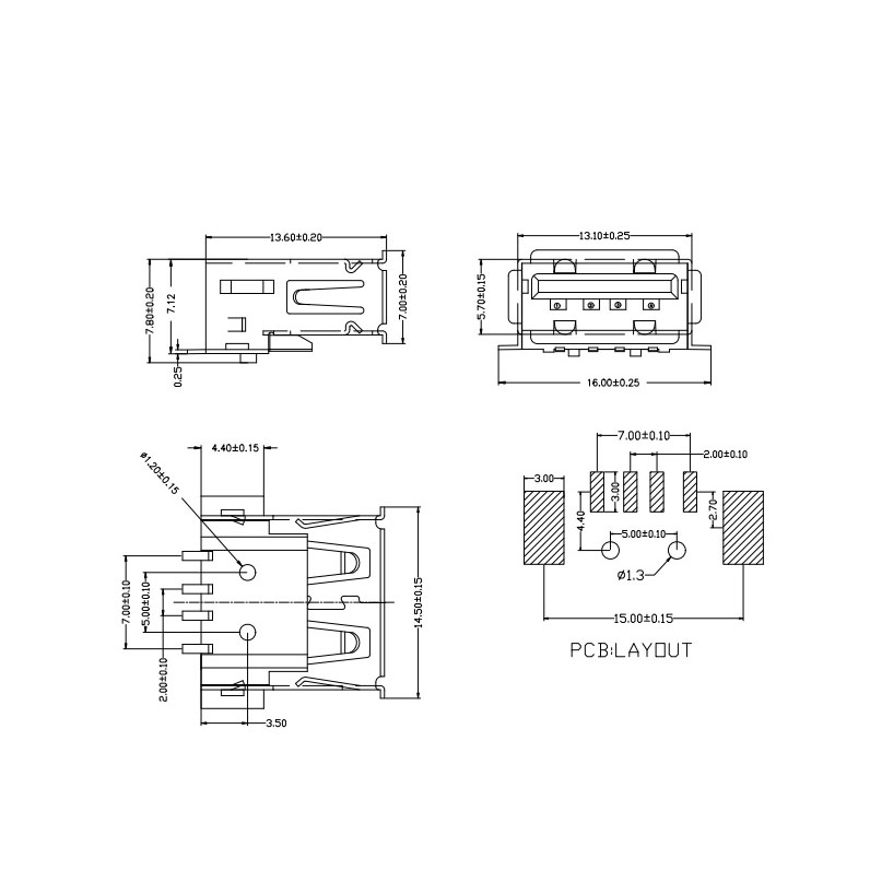 The SMD PCB Solder Right Angle Female Type-A USB Connector is a compact, surface-mount USB port designed for printed circuit boards (PCBs). Its right-angle design allows for space-efficient placement, making it ideal for applications requiring horizontal USB connections. It provides reliable power and data transfer for embedded systems, consumer electronics, and custom PCB designs.