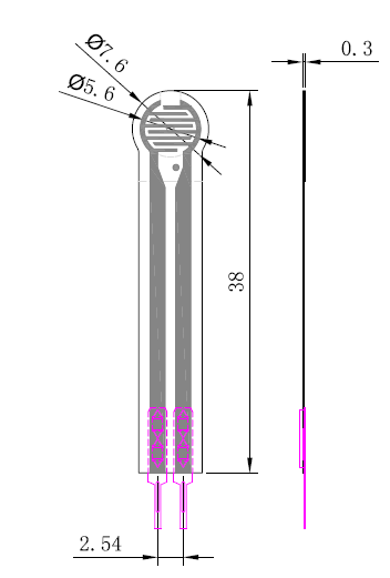 This is a circular flexible thin film pressure sensor of long legs with a diameter of 7.6mm, which can be used to realize highly sensitive detection of pressure. The sensor is durable and designed to sense static and dynamic pressure in a high respond speed. Its advantages of recording the intensity and frequency of force make it widely used in all kinds of applications, such as, pressure switch, bed monitoring system, intelligent sneaker and medical device system. These sensors are also very easy to use.RP-C flexible pressure sensor is made of ultra-thin film of excellent mechanical property, excellent conductive materials and nanometre pressure sensitive layers. There are thin film and pressure sensitive layer on the upper layer of the sensor, and thin film and conductive circuit on the lower layer. These two layers are glued together by double sided tape. When outside pressure applies to the active area, the disconnected circuit of the lower layer will be connected through the pressure sensitive layer of the upper layer, by which to convert pressure into resistance. The output resistance decreases as pressure increases.