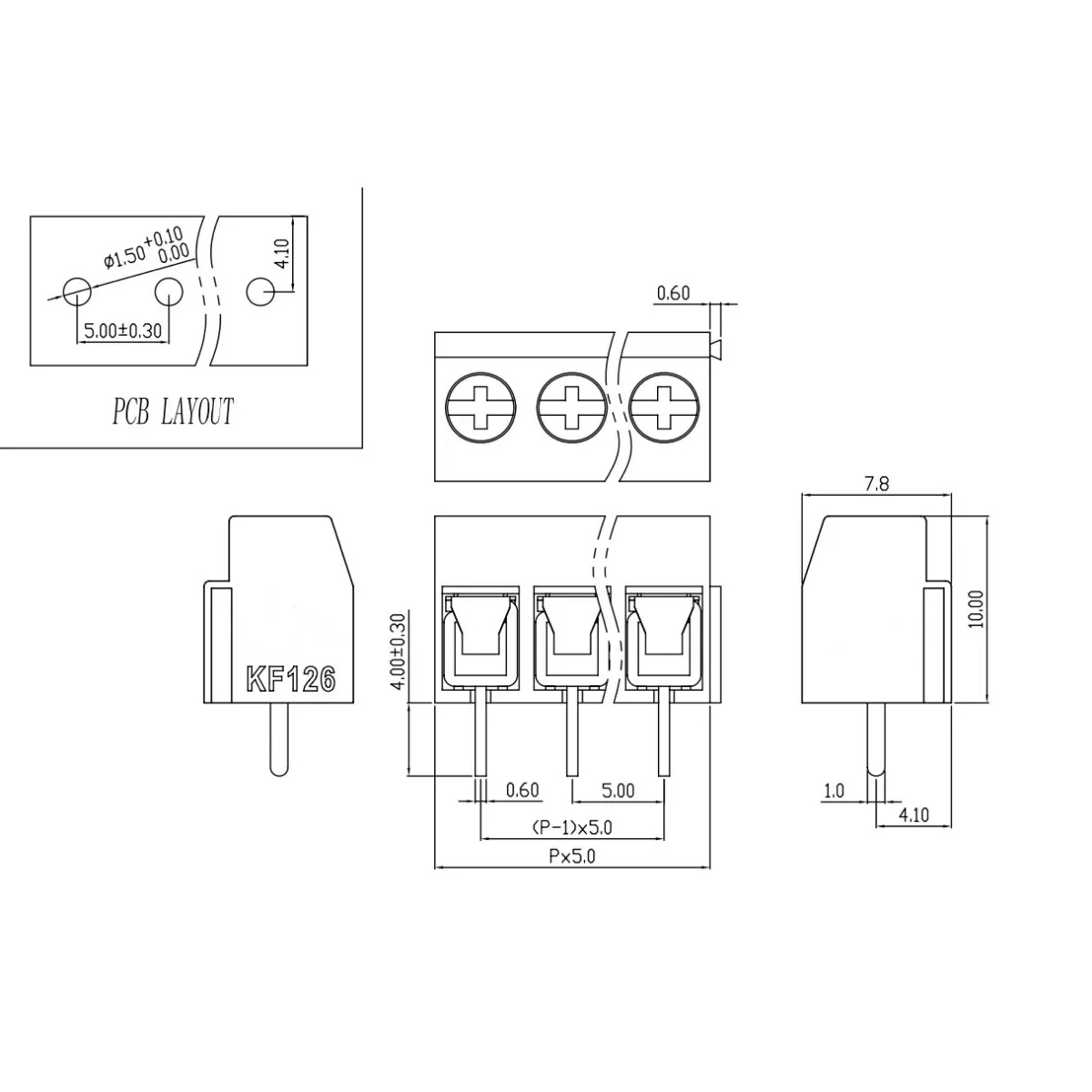 Secure your PCB wiring with this 3-pin KF126 screw terminal. Standard 5.0mm pitch, rated for 300V / 8A. Ideal for power and signal connections.