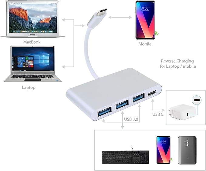 - Multi-port Design Expands a single USB Type-C port into 4 ports (3 USB-A & 1 USB-C).