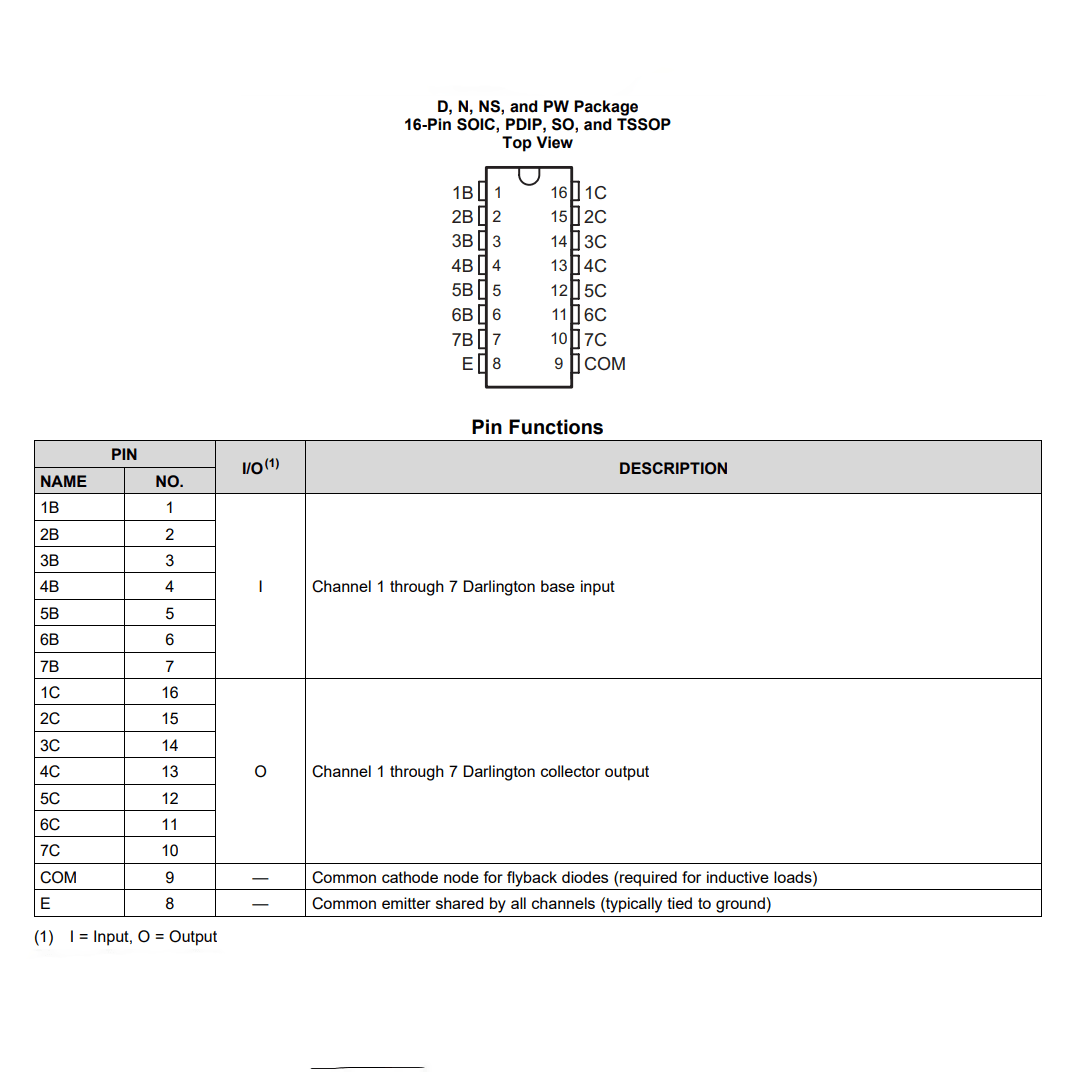 - Seven NPN Darlington pairs for high-current drive.