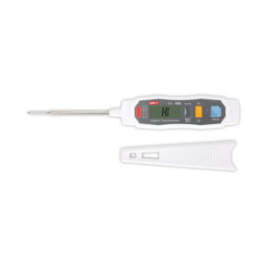 A61 is an IP65 rated thermometer with FDA certified stainless steel probe. It is equipped with a protective shell to prevent accidental skin puncture and burning. With its portable pen-like design, clear backlight display, and auto power off functions, A61 is a useful temperature measurement tool for cooking, refrigeration, heating, food processing and other applications.