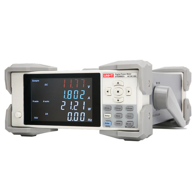 The UNI‑T UTE9802+ is an economical, portable digital power meter that combines multiple measurements voltage, current, active power, apparent power, power factor, and frequency into a single handheld instrument. Its VA‑style “broken‑code” display presents numeric data and status icons clearly, while a robust 32‑bit MCU and high‑speed A/D converter ensure fast, accurate readings.