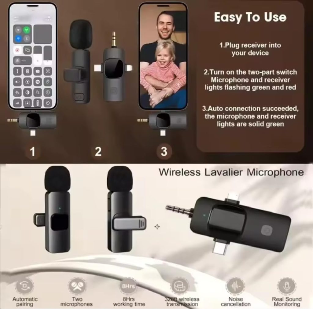 The Wireless Microphone Dual Omnidirectional is a versatile and high-quality audio device designed to work with a variety of devices, including smartphones with Type-C or Lightning connectors. This microphone captures clear and precise sound in all directions, making it ideal for podcasts, interviews, vlogs, and more. The wireless functionality offers users a hassle-free experience, providing greater mobility during recording sessions.